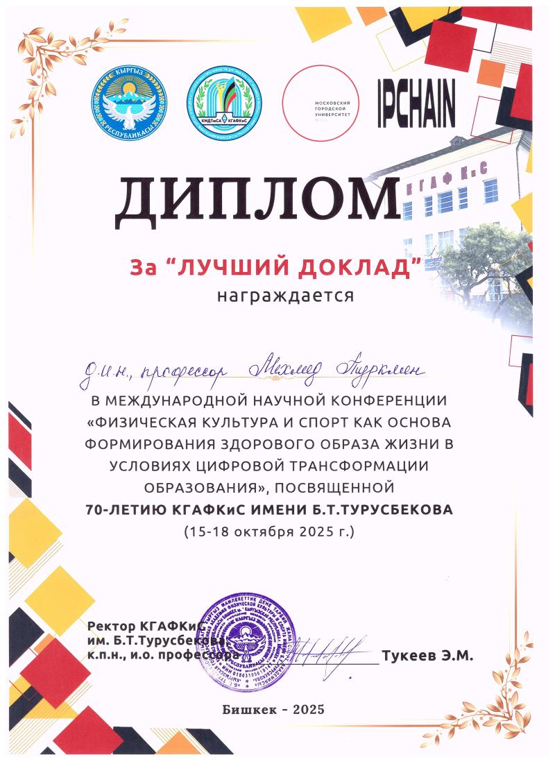 48 ülkeden 163 sunum ve 80 posterle katılım sağlanan ve Kırgızistan’ın başkenti Bişkek’te yapılan kongrede Prof. Dr. Mehmet TÜRKMEN, “From A Sociological Perspective: Traditional Games And Social İntegration” isimli bildirisi ile birincilik ödülüne layık görüldü.