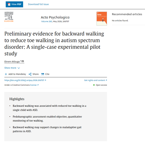 Fakültemiz Beden Eğitimi ve Spor Bölümü öğretim üyelerinden Doç. Dr. Ekrem AKBUĞA’ nın "Preliminary Evidence for Backward Walking to Reduce Toe Walking in Autism Spectrum Disorder: A Single-Case Experimental Pilot Study" başlıklı çalışması, Web of Science SSCI indeksli ve Q2 kategorisindeki Acta Psychologica dergisinde yayımlanmıştır.
